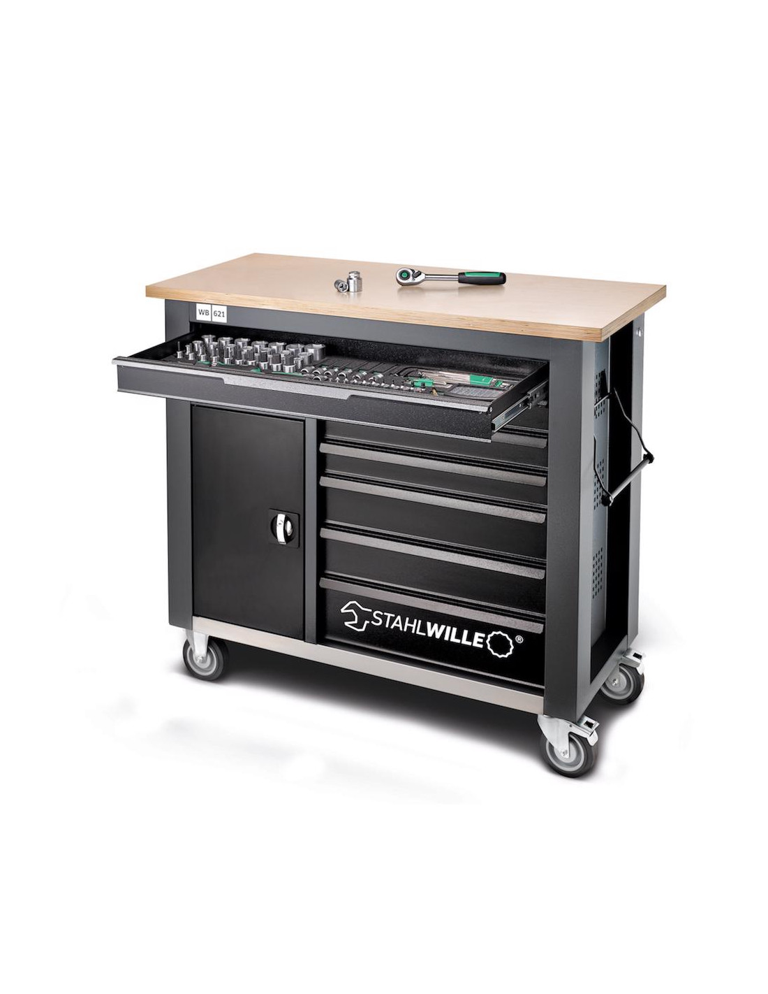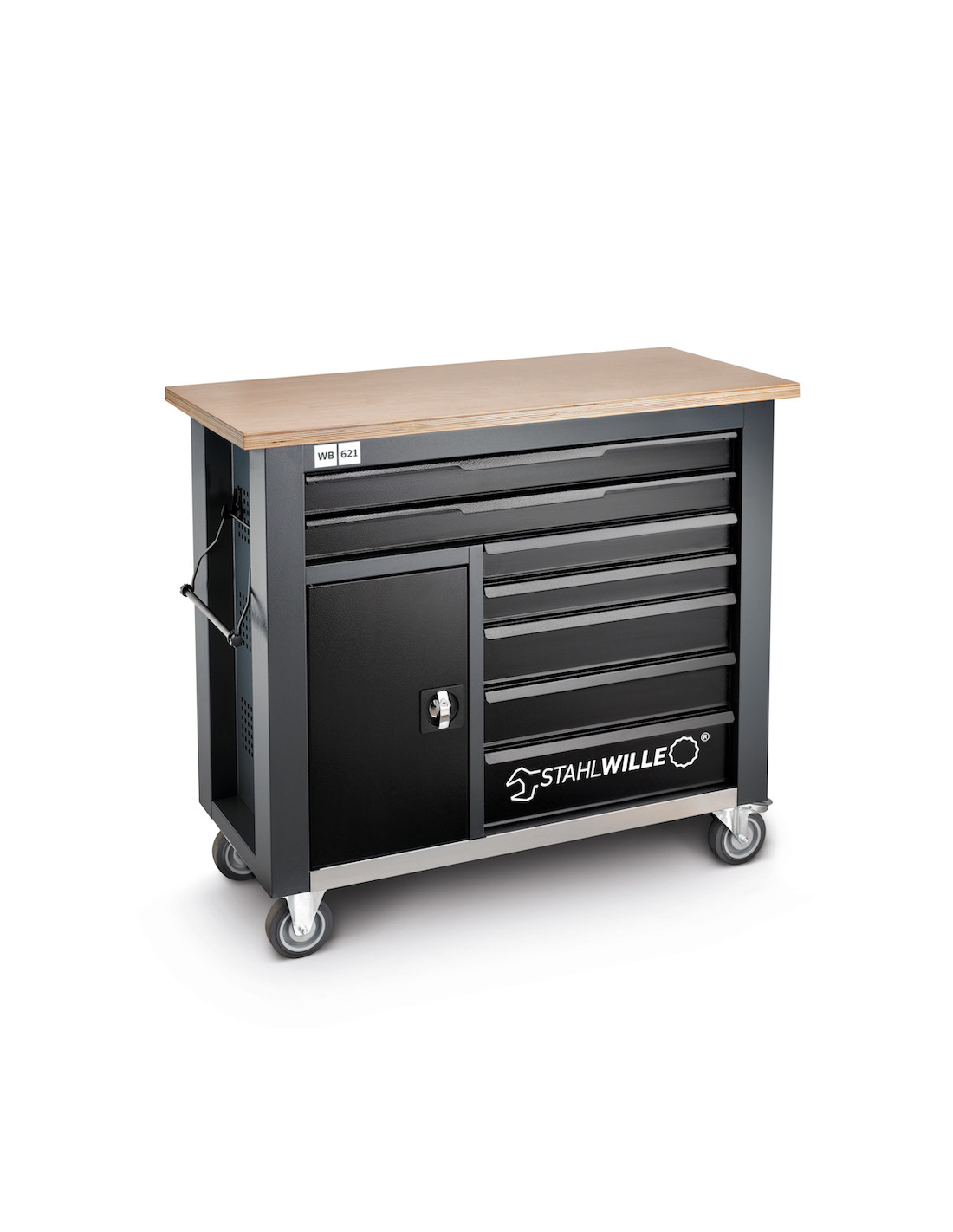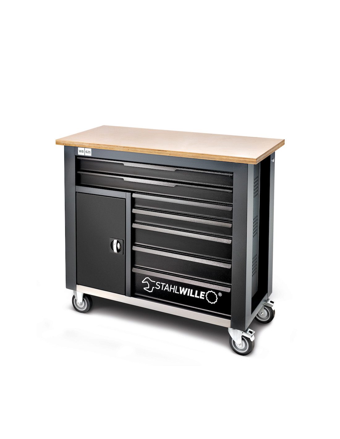 Stahlwille 85010621, Banc de lucru mobil WB 621, 7 sertare cu glisare completă, compartiment lateral, blat din lemn, închidere centralizată, doar bancul