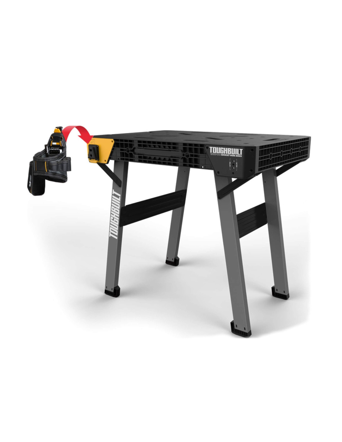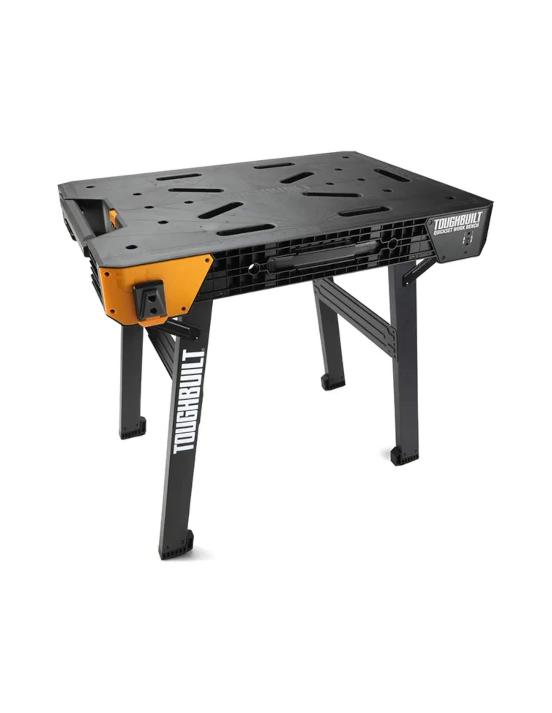 Bancul de lucru ToughBuilt® QuickSet este o suprafață de lucru robustă, configurată în câteva secunde. Pur și simplu împingeți eliberarea și trageți în sus de mâner pentru a plia picioarele pentru a crea o suprafață mare de lucru oriunde. Picioarele metalice robuste pot susține până la 1.000 lb. Suprafața mare de lucru oferă o gamă largă de aplicații: excelentă pentru tăiere, găurire, prindere și multe altele. Este compatibil cu linia extinsă de pungi ClipTech a ToughBuilt pentru organizarea supremă a instrumentelor. Fixați instantaneu pungile și instrumentele pentru a face fiecare lucrare organizată și eficientă. De la atelier, la camion, la șantier, acest banc de lucru este ușor de transportat oriunde trebuie să mergeți.