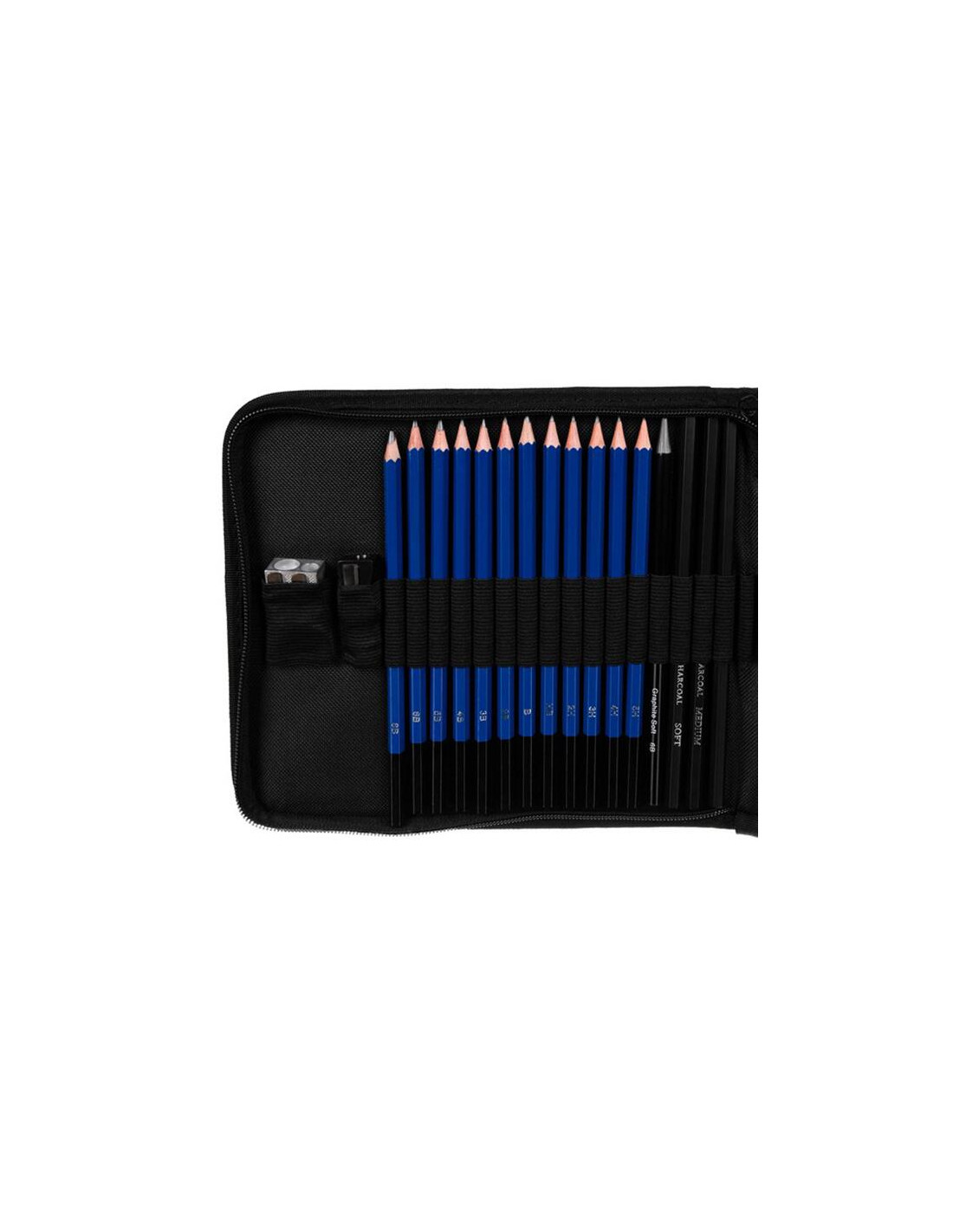 - Contine o selectie bogata si completa de instrumente destinate desenului in creion sau conceperii schitelor/portretelor. Setul contine: 12 creioane (2H, 3H, 4H, 5H, HB, B, B2, B3, B4, B5, B6, B8), un creion grafit (6B), 3 creioane cu carbune (moale, mediu si dur), un cutter, un prelungitor pentru creion, doua ascutitori, 3 lame de ascutire, radiera pentru creion, radiera pentru grafit, 3 bucati de carbune (moale, mediu si dur), 3 bucati de grafit (moale, mediu si dur), o paleta de smirghel si un penar.