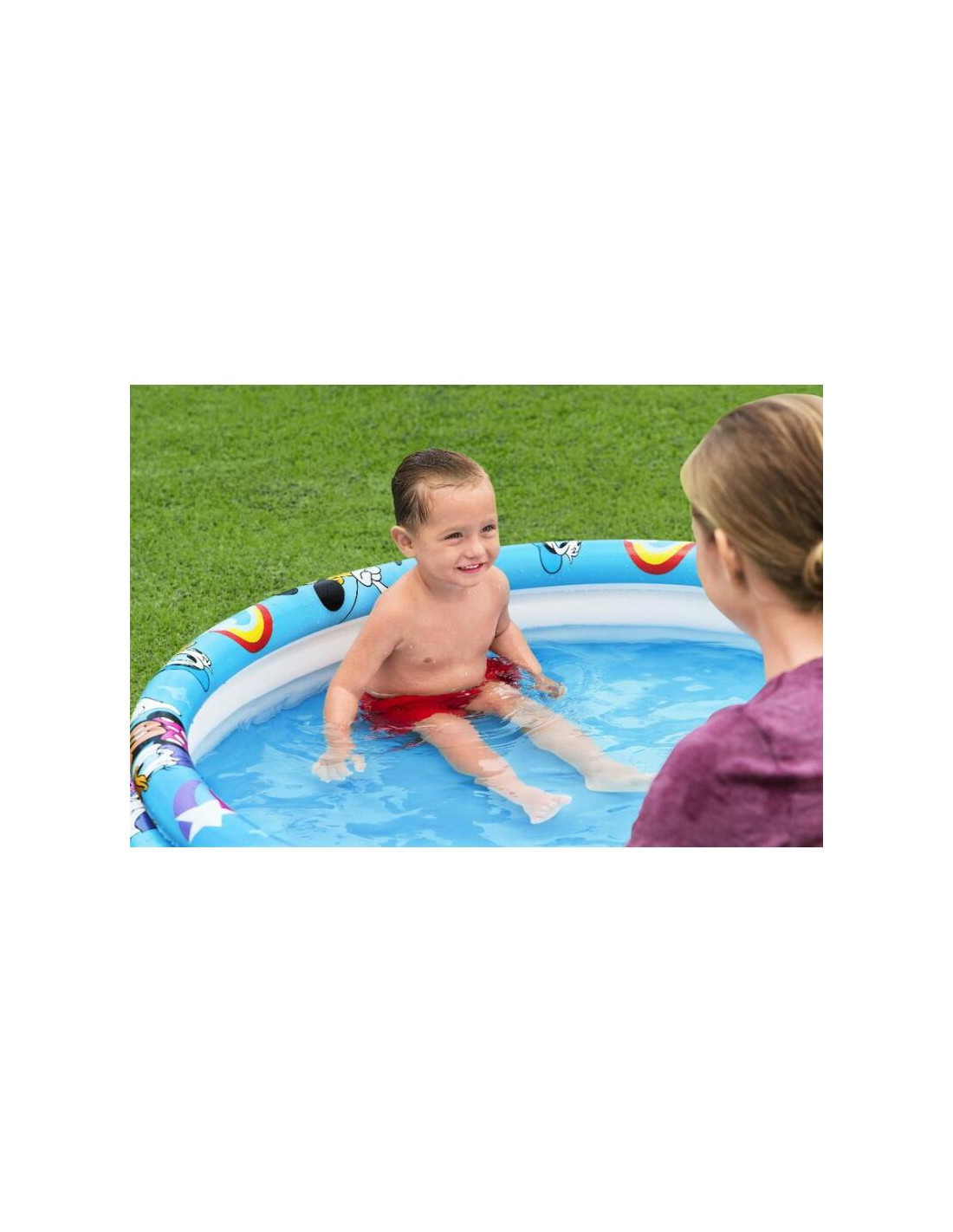 Cele 3 inele identice care alcatuiesc piscina sunt usor de umflat atunci cand sunteti gata de distractie in apa si pot fi pur si simplu dezumflate si pliate cand s-a terminat inotul. Peretii largi ofera stabilitate si suport pentru joaca copiilor. La sfarsitul utilizarii, apa poate fi drenata folosind robinetul de scurgere usor de utilizat.