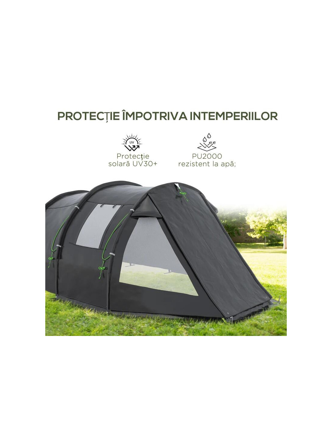 - Cortul beneficiaza inclusiv de un material cu rol de podea. Acest material pastreaza interiorul uscat in cazul in care ansamblul este instalat pe o suprafata umeda.