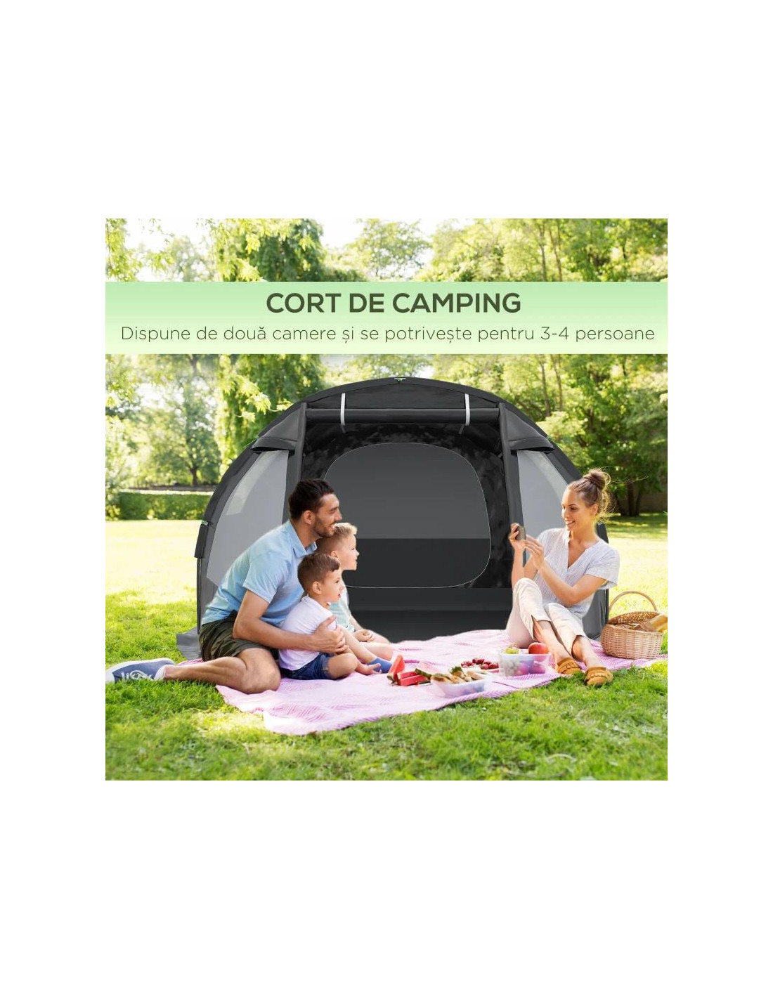 Cort camping, 3-4 persoane, impermeabil, cu vestibul, negru, 475x264x172 cm