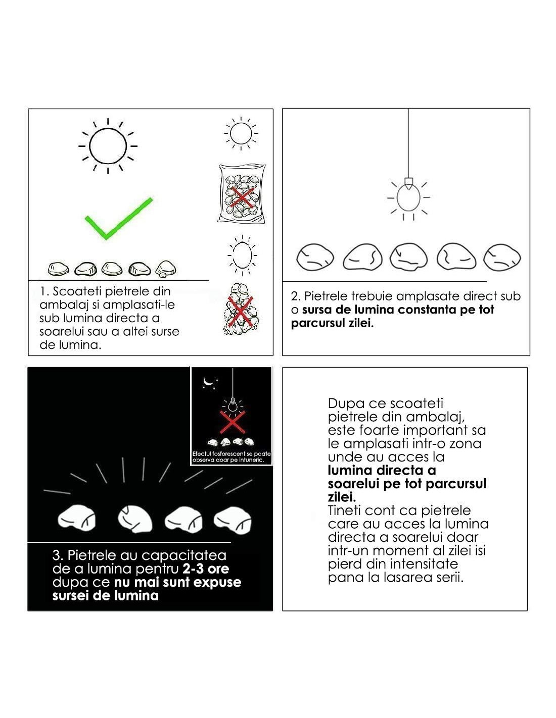 - Retineti faptul ca este foarte important sa amplasati pietrele intr-o zona unde au acces la lumina directa a soarelui pe tot parcursul zilei. Va recomandam sa NU le amplasati la umbra.