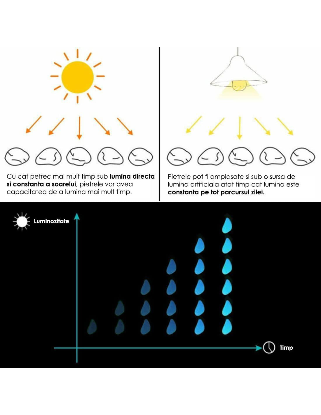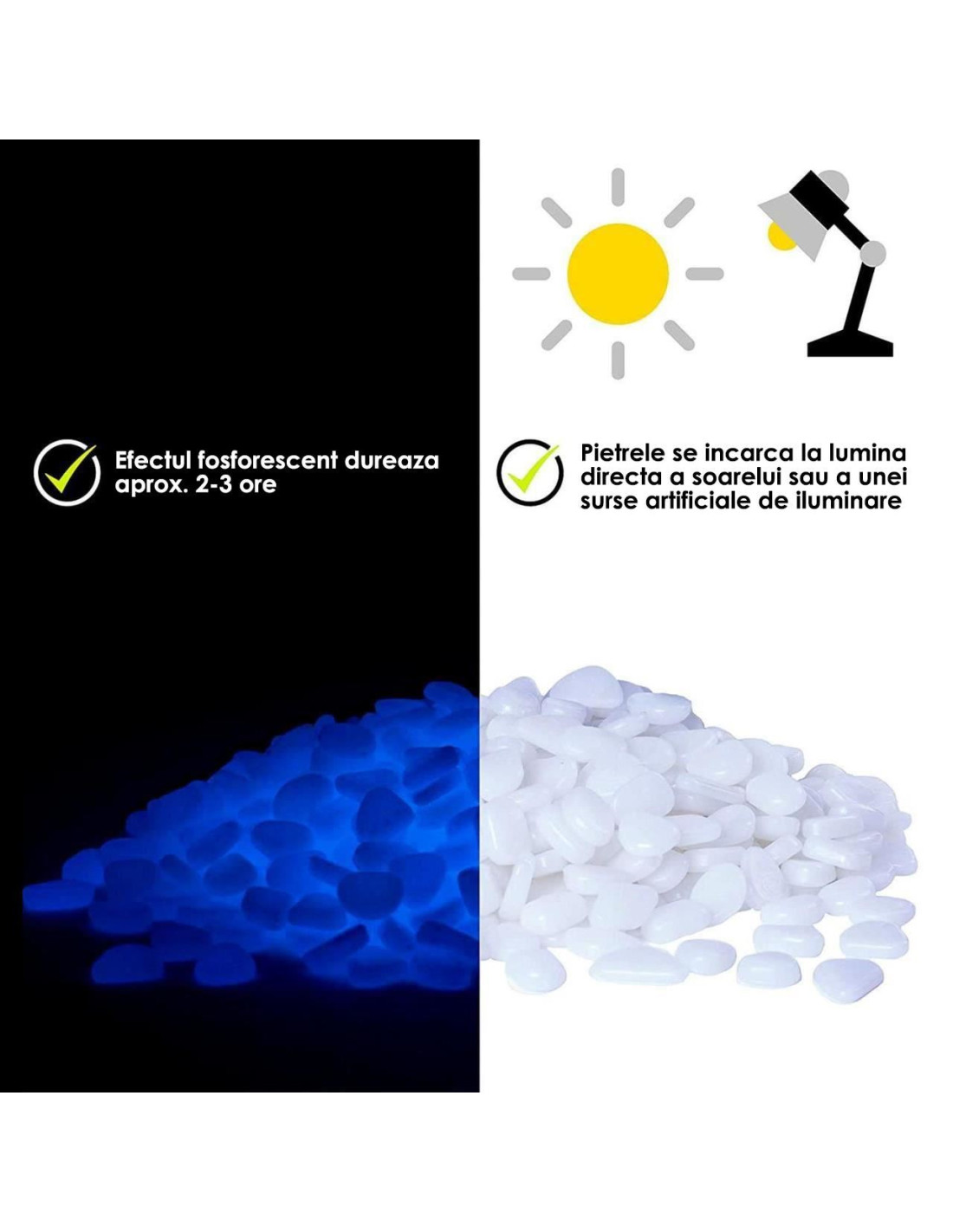 Pietrele fosforescente sunt un decor pentru casa sau gradina ta. Acestea acumuleaza lumina in timpul zilei si stralucesc in culoare de basm noaptea. Vor arata de asemenea frumos in ghivece, in acvariu sau ca element decorativ in compozitii florale. Pietrele decorative fosforescente sunt concepute pentru gradina, folosite pentru decoratiuni interioare si compozitii florale sau cadouri. In intuneric, acestea stralucesc dupa expunere la lumina.
