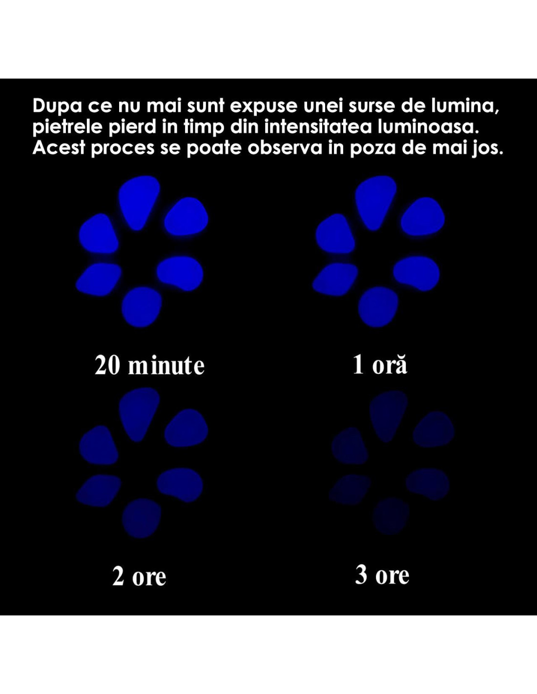 - Dupa ce nu mai sunt expuse unei surse de lumina, pietrele in timp pierd din intensitatea luminoasa. Acest proces dureaza aprox. 2-3 ore.