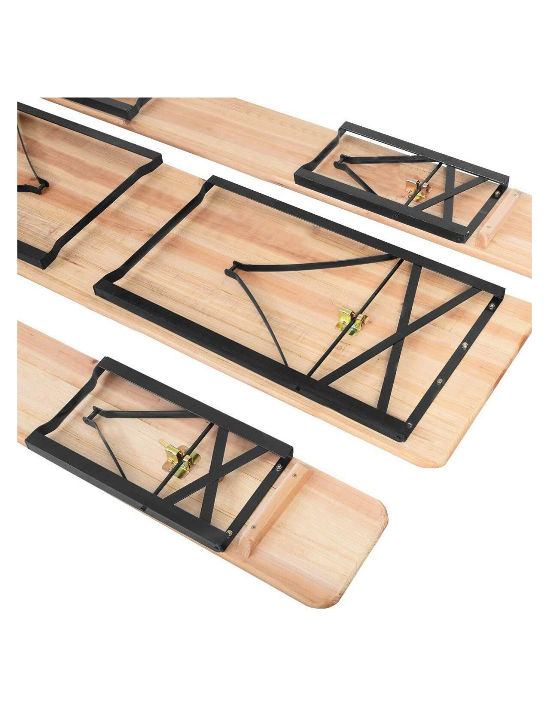 Cele doua banci sunt realizate cu sezut din lemn si un cadru metalic care se pliaza pentru o depozitare usoara, mai ales pe timpul iernii. Astfel devin portabile si rapid de configurat, setul reprezentand solutia ideala pentru spatii inguste si, de asemenea, reprezinta o idee rapida si practica.