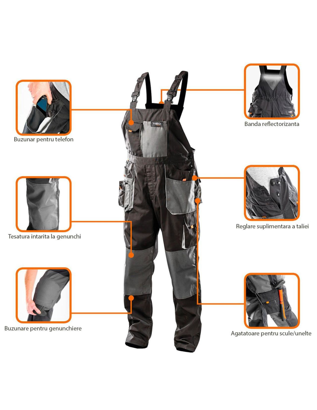 Au buzunare speciale pentru genunchiere, dar si buzunare solide pentru a stoca si transporta uneltele necesare in timpul lucrului.