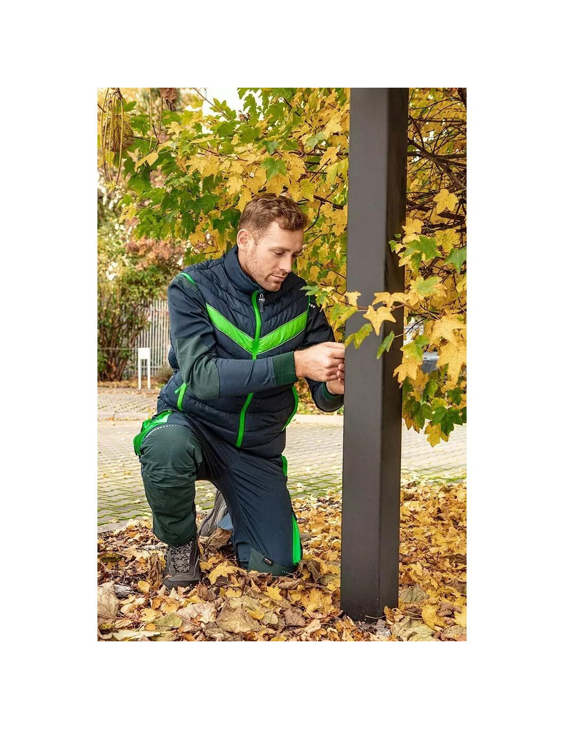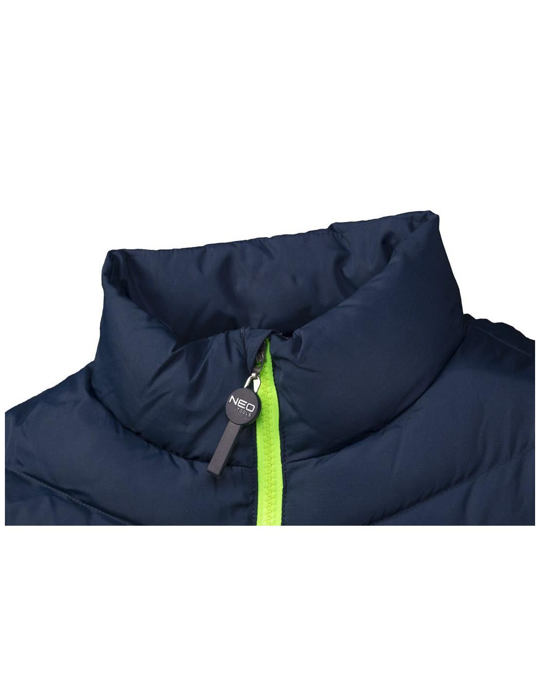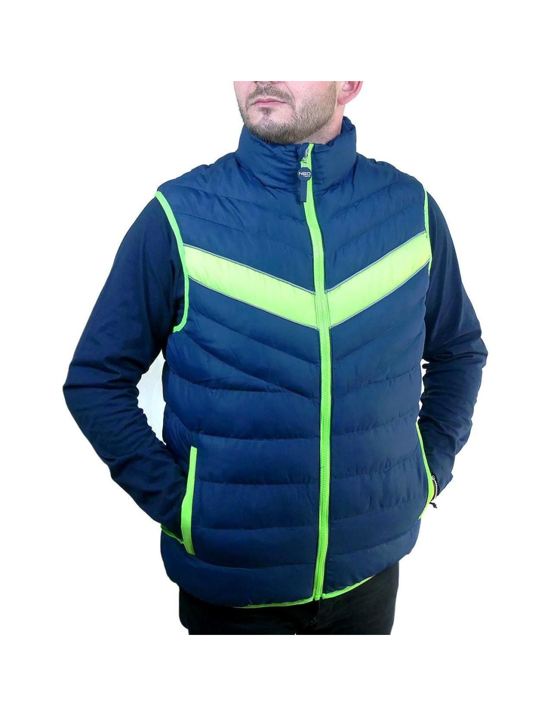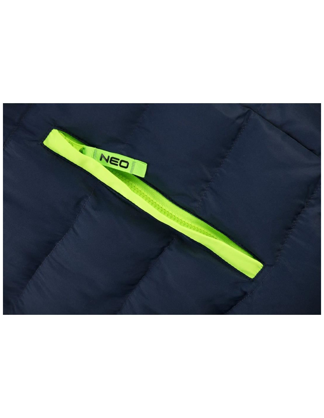 Vesta de lucru matlasata PREMIUM de la NEO are o combinatie moderna de albastru marin cu accente verzi.