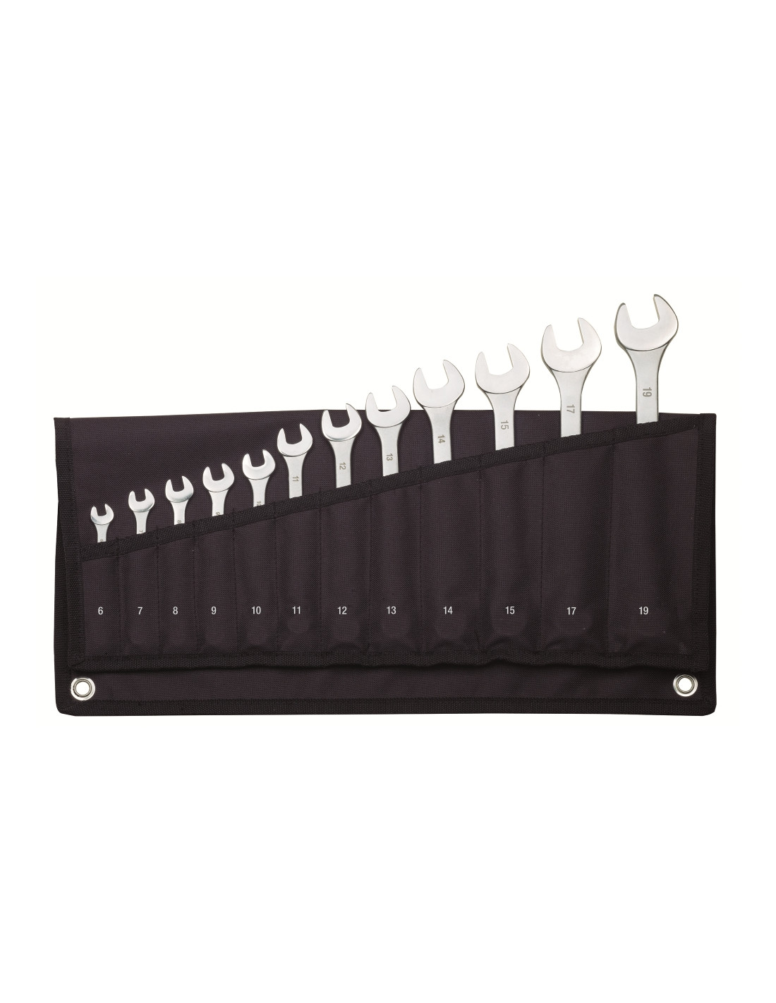 Setul contine cheile fixe: 6 – 7 – 8 – 9 – 10 – 11 – 12 – 13 – 14 – 15 – 17 si 19mm. Marimile cheilor sunt marcate cu laser, dimensiunile fiind clar vizibile.