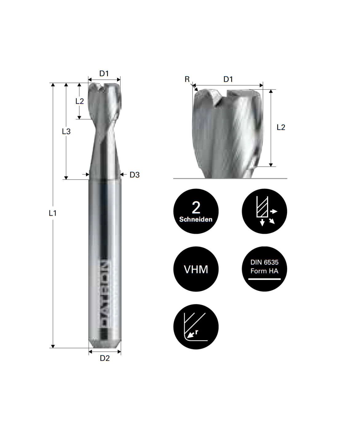 Freza pentru adâncime, cu raza la muchie R 1.0, Datron 0068460F, 2 caneluri, 6.0x7.0x6.0mm