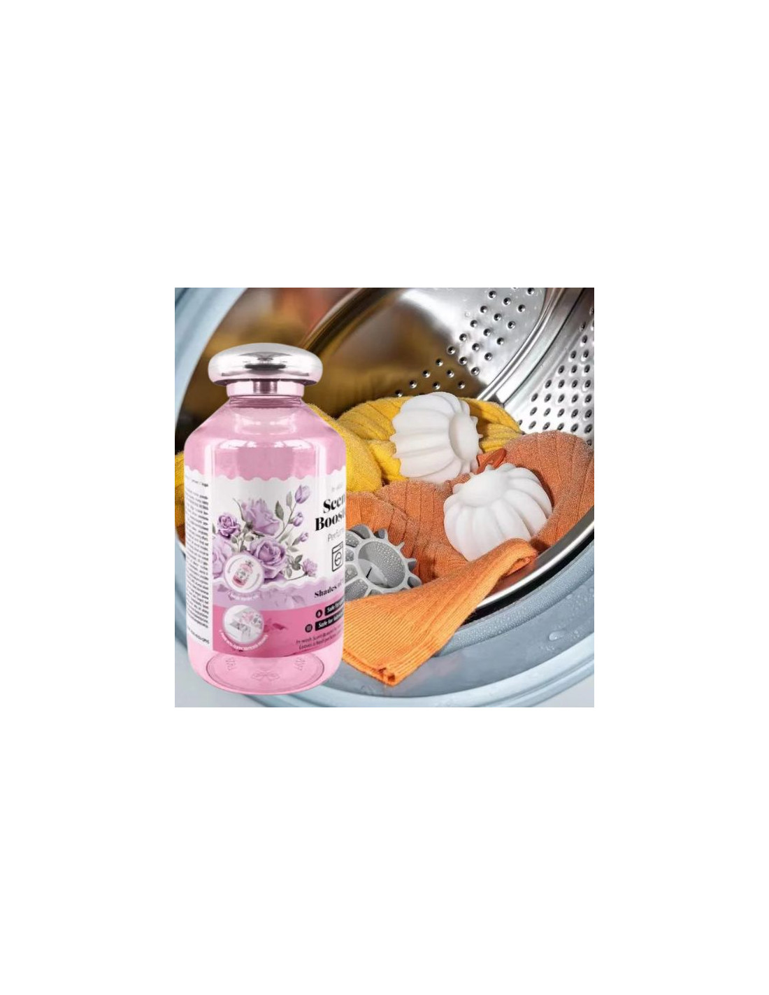 Setul contine un flacon de 250 ml parfum pentru masina de spalat, cu o aroma proaspata si rafinata, si 4 bile anti-incurcare haine MagicBall, care separa eficient rufele pentru o curatare mai buna.