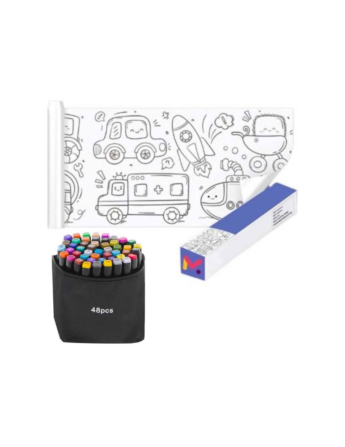 Set creativ cu rola hartie autoadeziva model masini si set 48 markere cu alcool cu doua capete
