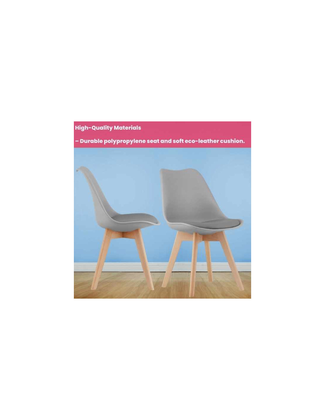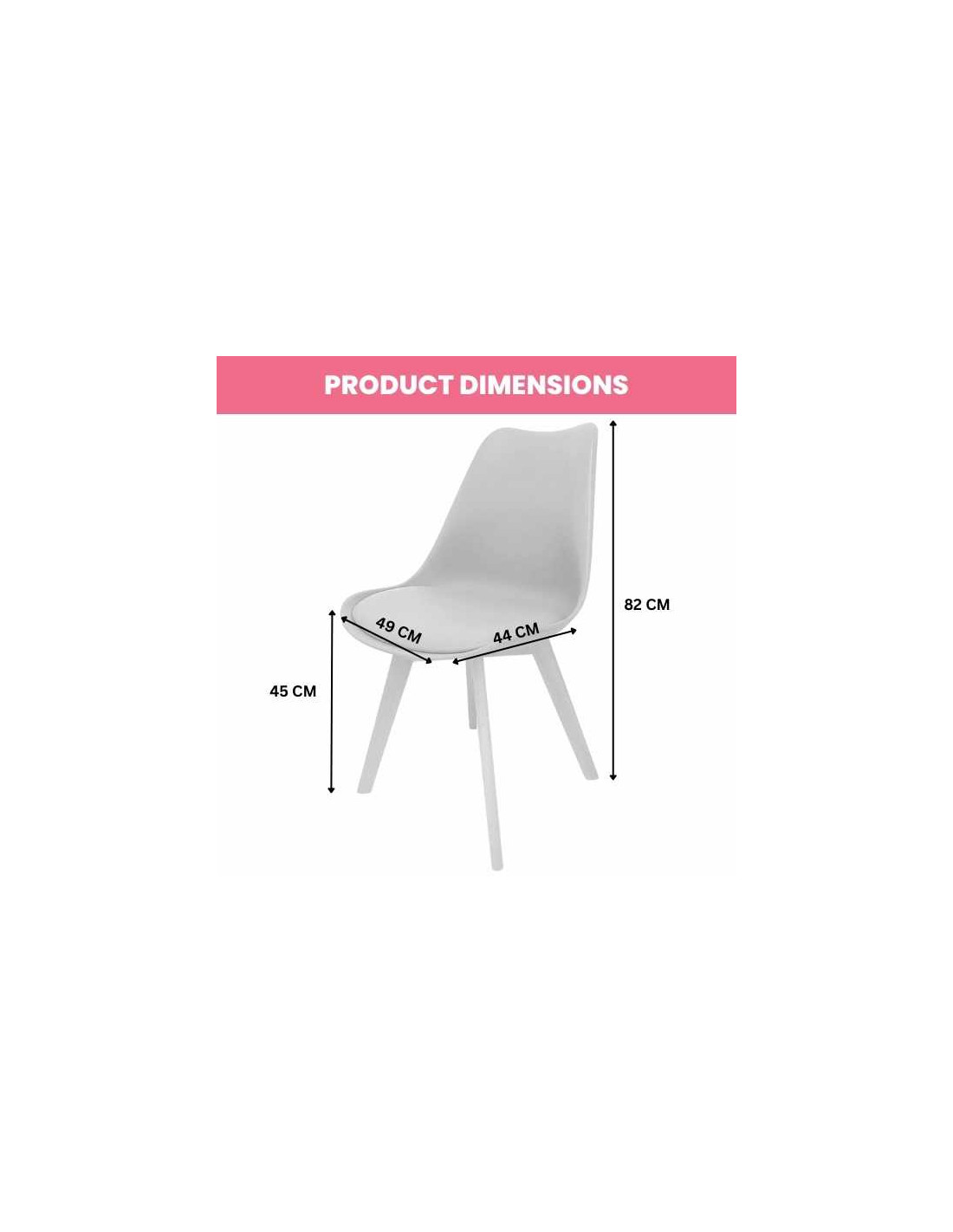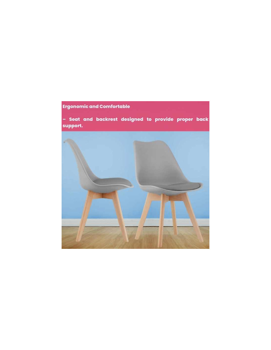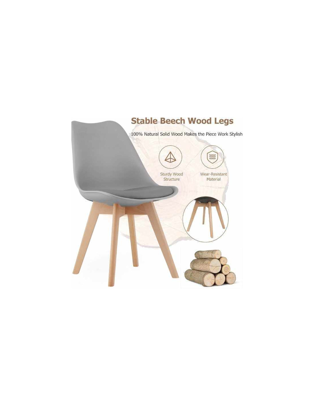 Acest model este realizat din polipropilena gri deschis, rezistenta la uzura, si este completat de o perna moale din piele ecologica si picioare din lemn de fag natur, oferind un echilibru perfect intre functionalitate si eleganta naturala. Este ideal pentru spatii de dining, birou sau camere de studiu.