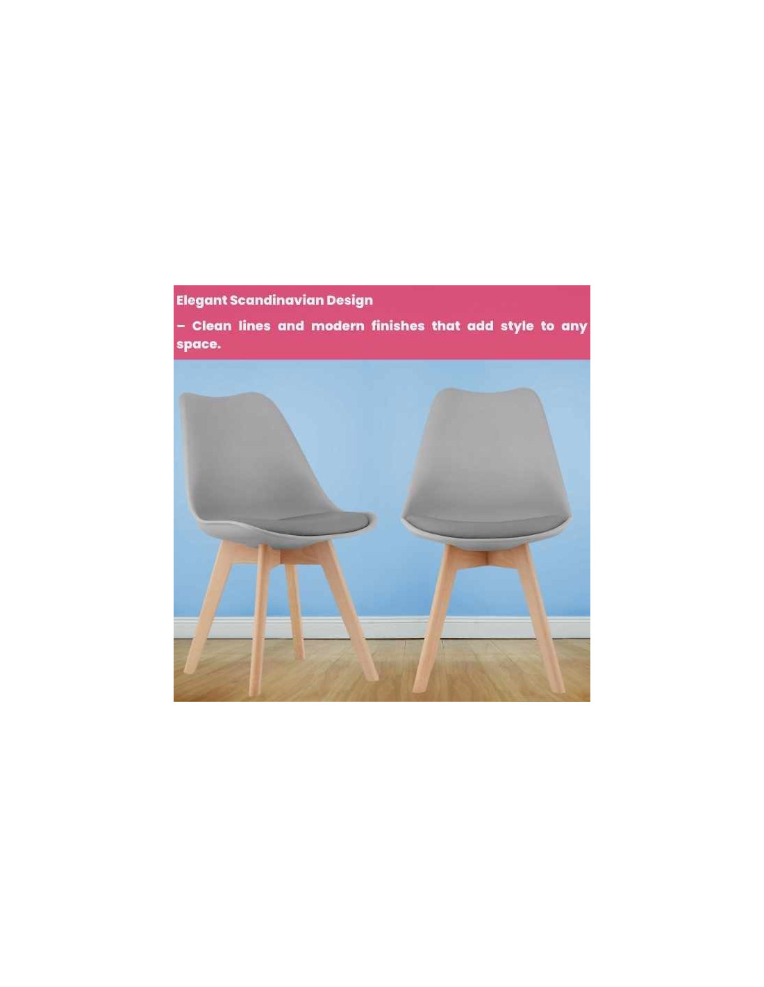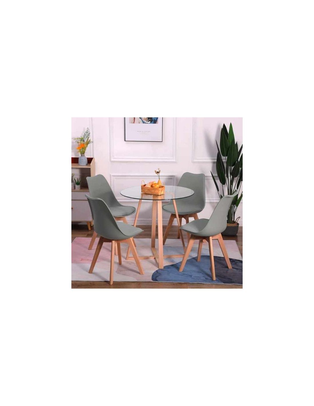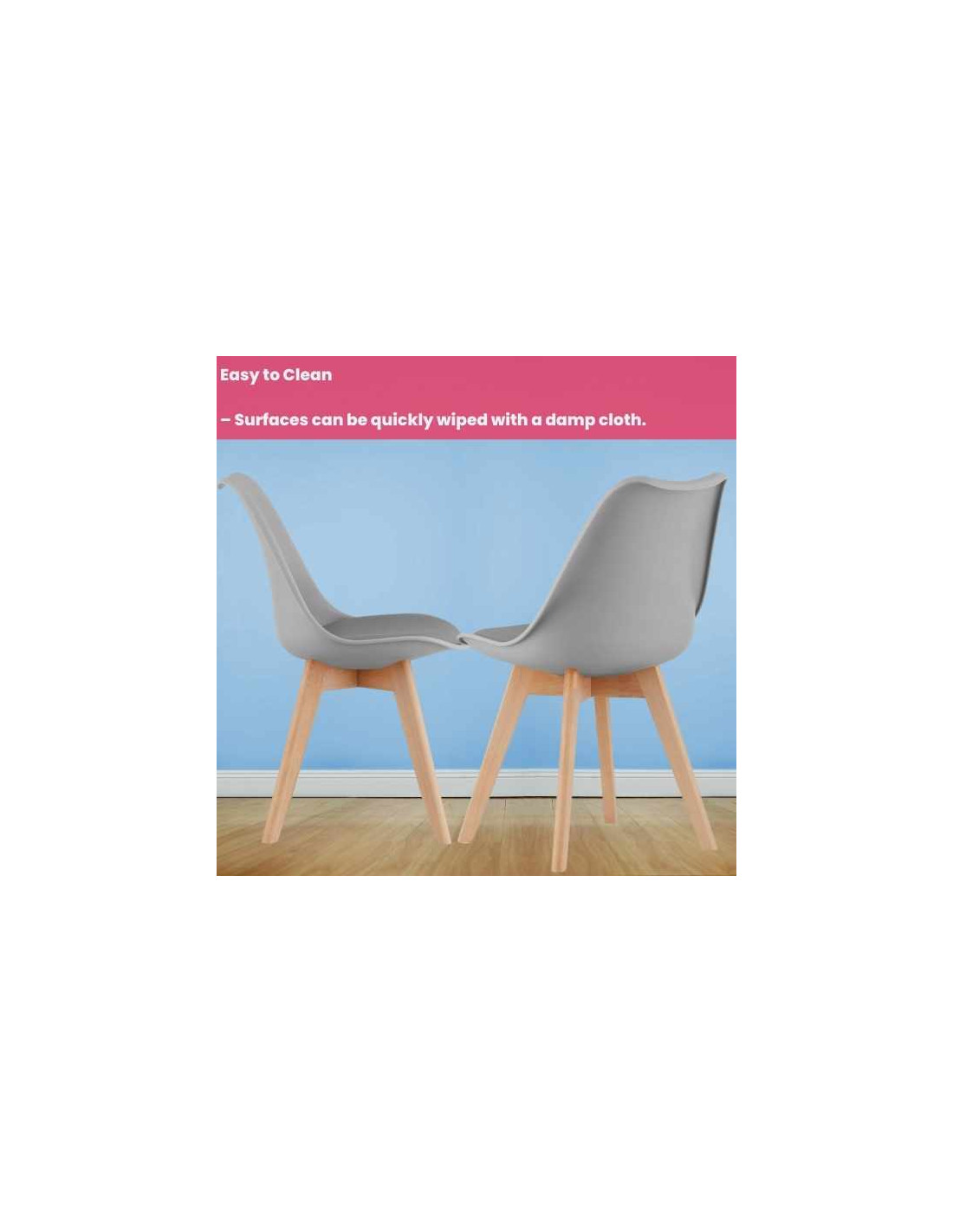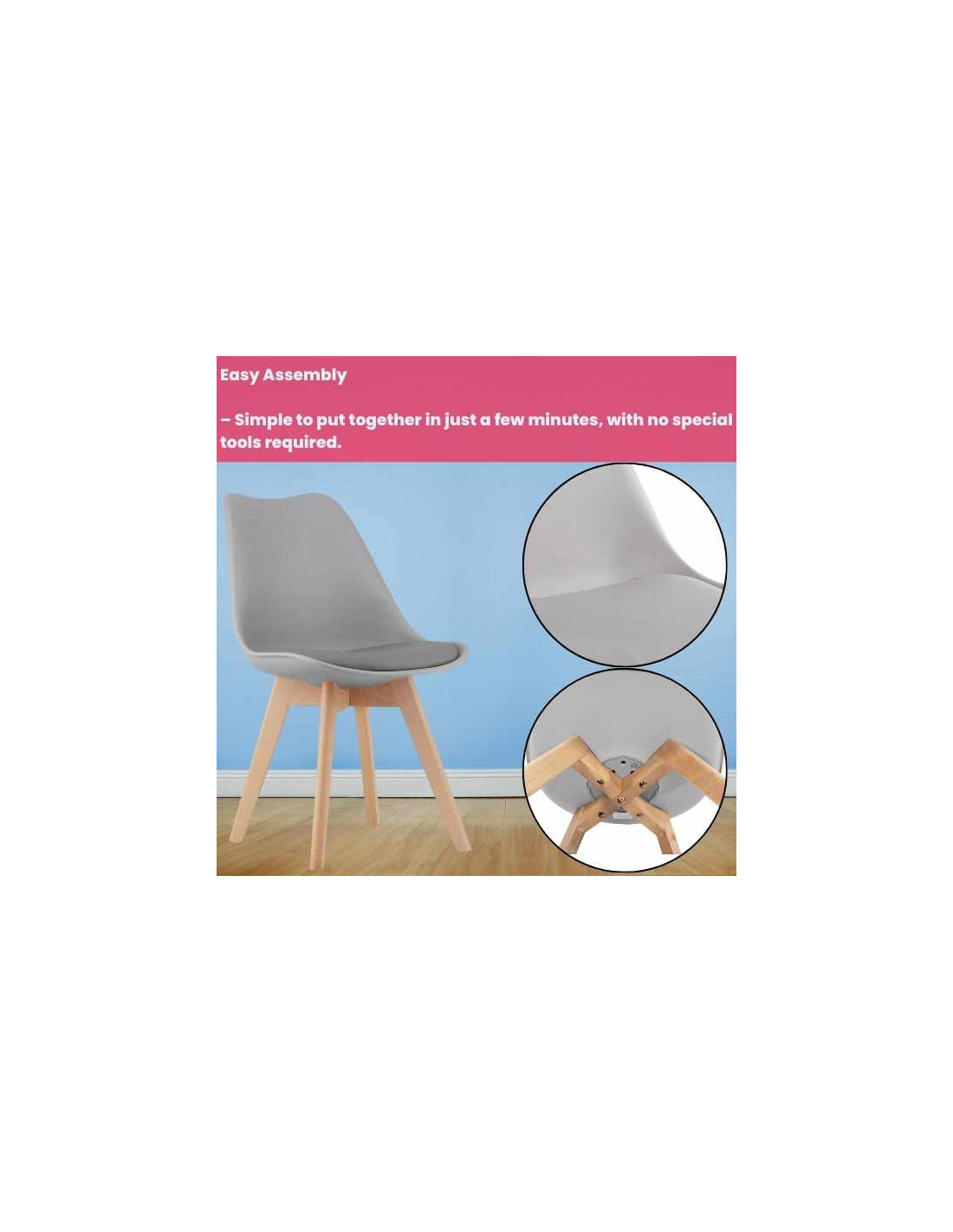 Acest model este realizat din polipropilena gri deschis, rezistenta la uzura, si este completat de o perna moale din piele ecologica si picioare din lemn de fag natur, oferind un echilibru perfect intre functionalitate si eleganta naturala. Este ideal pentru spatii de dining, birou sau camere de studiu.